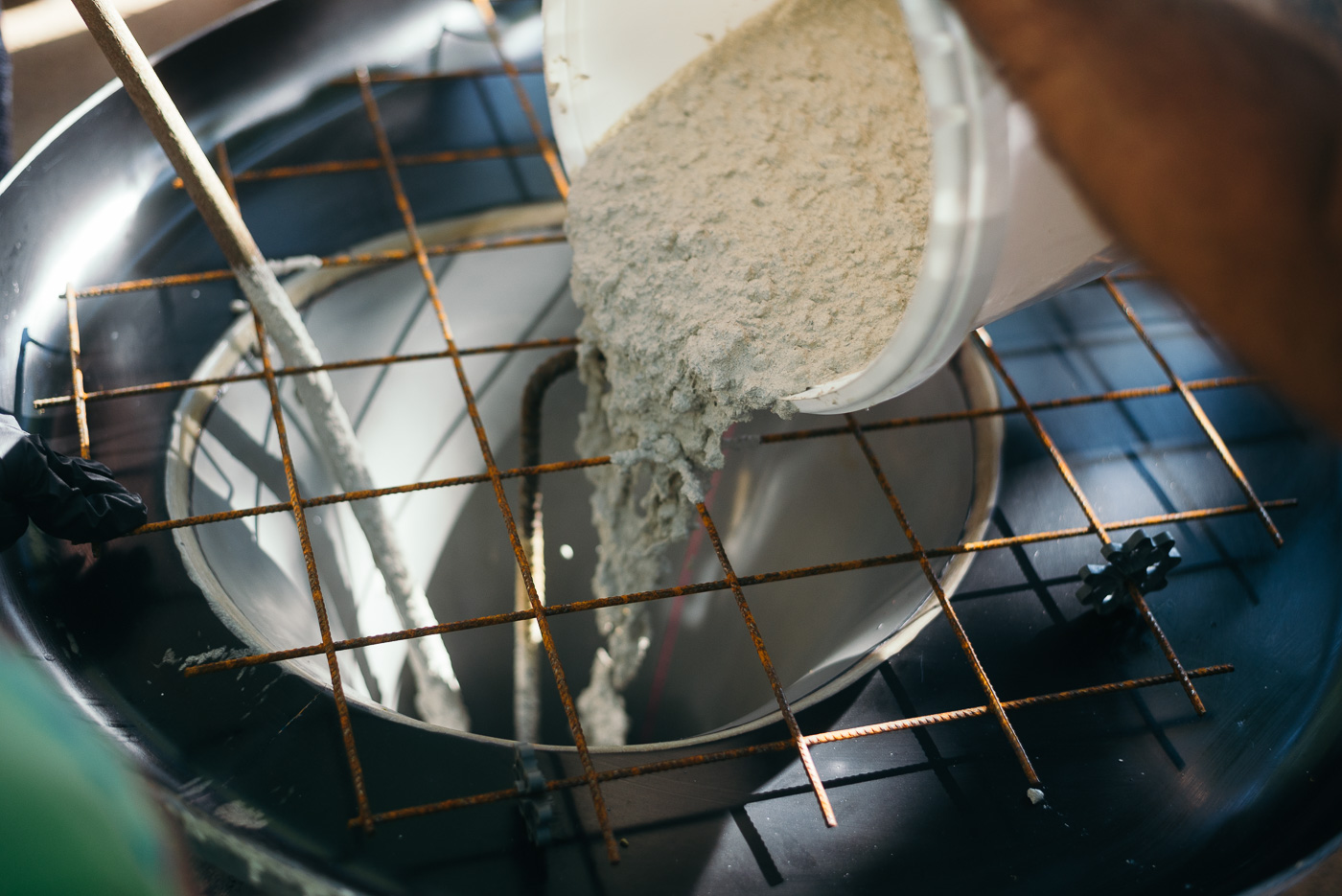 Dali nám úplně luxusní beton, ze kterého jsme byli nadšení. Jednalo se o speciální upravenou recepturu betonu z unikátního bílého cementu, kterou nám vyvinuli na míru technologové z TBG. Byl to jemnozrnný samozhutnitelný bílý beton COLORCRETE, který má nádherný povrch, je hodně ušlechtilý a v architektuře se používá jako pohledový konstrukční prvek. Dodávají je v různých barvách. Původně měly být stoly šedé, ale na vizualizacích jsem je měla bílé. Řediteli společnosti se to strašně líbilo a řekl, že to prostě musí být bílé. Následně nám z TBG Metrostav vyslali 3x za sebou autodomíchávače, aby nám přivezl pokaždé 1 kubík betonu, ze kterého se použilo asi jen 200 litrů, zbytek museli zrecyklovat. To všechno – materiál i dovoz – nám poskytli zdarma. To bylo od nich neuvěřitelně velkorysé. Za odměnu, že nám ve společnosti TBG Metrostav takto vyšli vstříc, jsme společně odlévali jeden stůl i u nich na betonárně na parkovišti, který je tam doteď. Forma je opakovatelně použitelná, takže v případě zájmu je možné vyrobit na zakázku i další stoly.